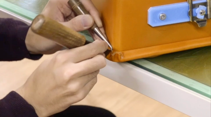 底部的角落容易與地面或牆壁碰撞,因此需要堅固,透過使用稱為「kizami」的技術將織物聚集在角落周圍,使其變得耐用。背面反面無缺口,布料挺括美觀。由於更多的折疊集中在一側,因此需要高水準的技能。